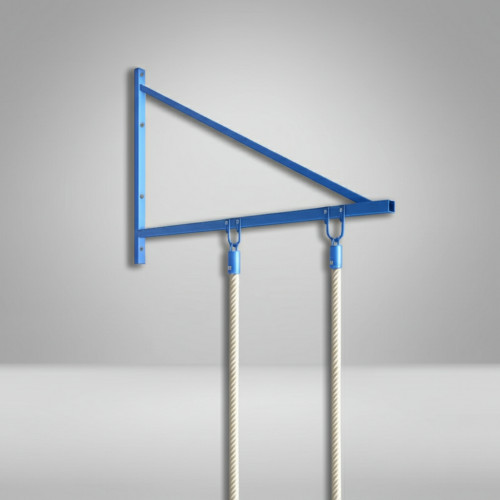 Данная консоль предназначена для надежного крепления одного или двух спортивных снарядов, таких как гимнастические канаты и шесты. Она крепится к стене, и основание имеет треугольную форму с отверстиями для анкерных болтов, что обеспечивает устойчивость конструкции. На дальнем конце консоли имеется петля для крепления каната, а также две растяжки из стального троса, которые обеспечивают дополнительную безопасность.