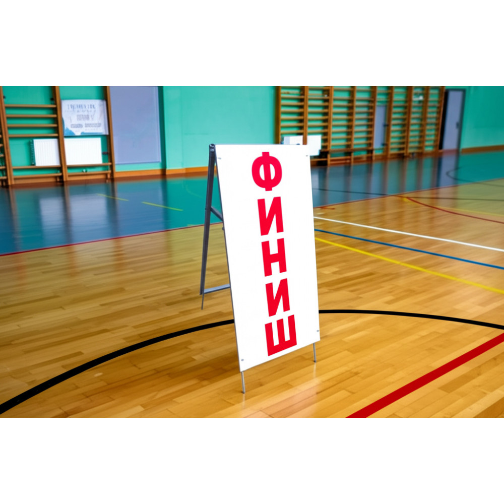 Стойка старт-финиш выполнена на прочном металлическом каркасе и изготовлена из влагостойкой фанеры, высота которой составляет 1500 мм, а ширина - 500 мм.