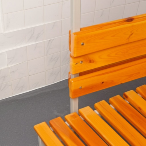 Скамейка оснащена вешалками, имеющими по 6 крючков с каждой стороны, что позволяет удобно размещать одежду и личные вещи. Это делает модель идеальной для коллективного использования в раздевалках.